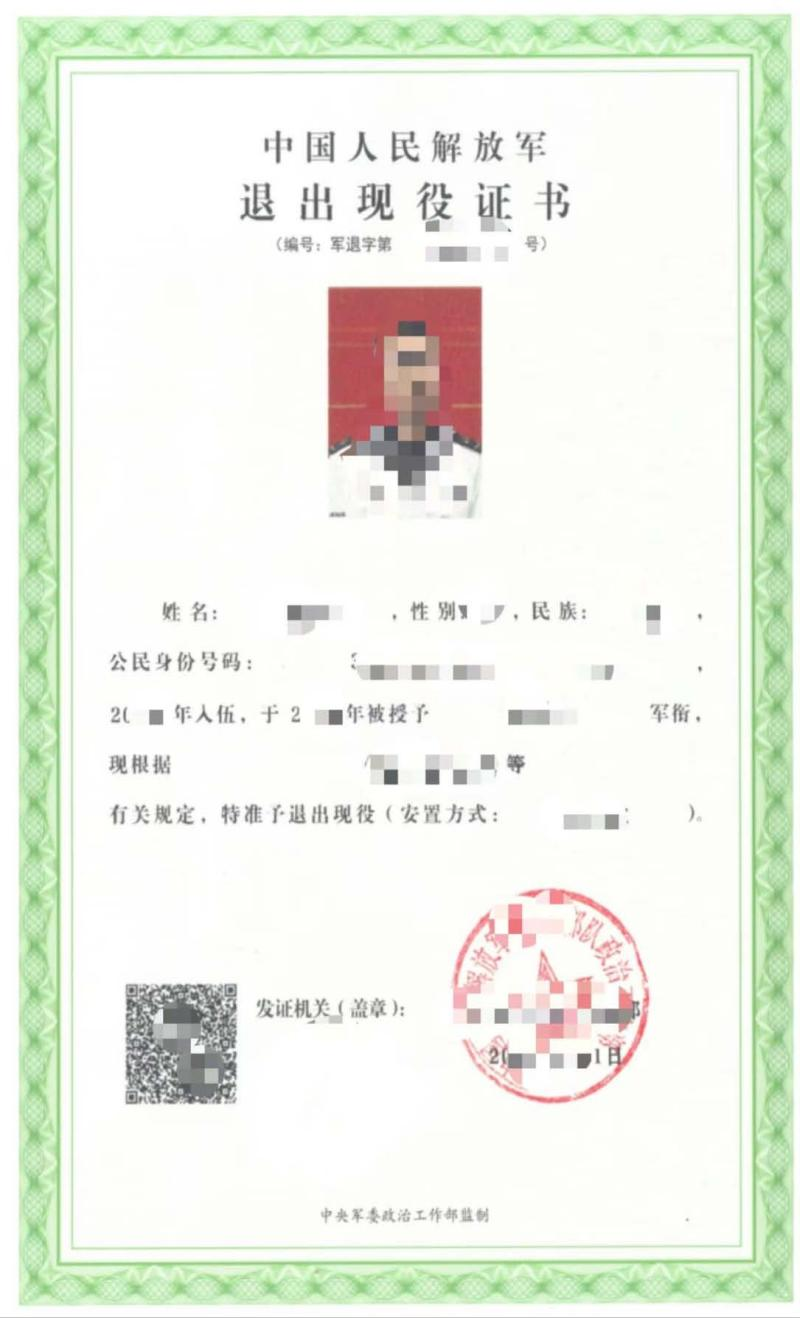 附件八:退出现役证示例照片